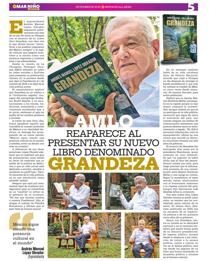 El expresidente Andrés Manuel López Obrador reapareció públicamente tras más de un año de retiro en Chiapas con el anuncio de su nuevo libro Grandeza, una obra con la que afirma buscar “reivindicar a los pueblos originarios del México antiguo” y el legado cultural que asegura mantiene a la nación como una potencia espiritual y artística pese a las adversidades.