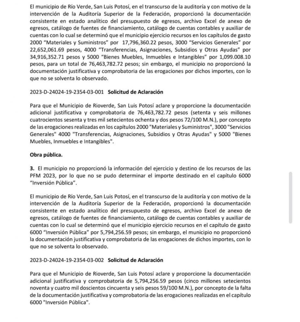 “Se ha expedido la solicitud de aclaración para que el Municipio de Rioverde, aclare y proporcione la documentación adicional justificativa y comprobatoria de 76,463,782.72 pesos (setenta y seis millones cuatrocientos sesenta y tres mil setecientos ochenta y dos pesos 72/100 M.N.), por concepto de las erogaciones realizadas: Materiales y Suministros, Servicios Generales, Transferencias, Asignaciones, Subsidios y Otras Ayudas y Bienes Muebles, Inmuebles e Intangibles”.