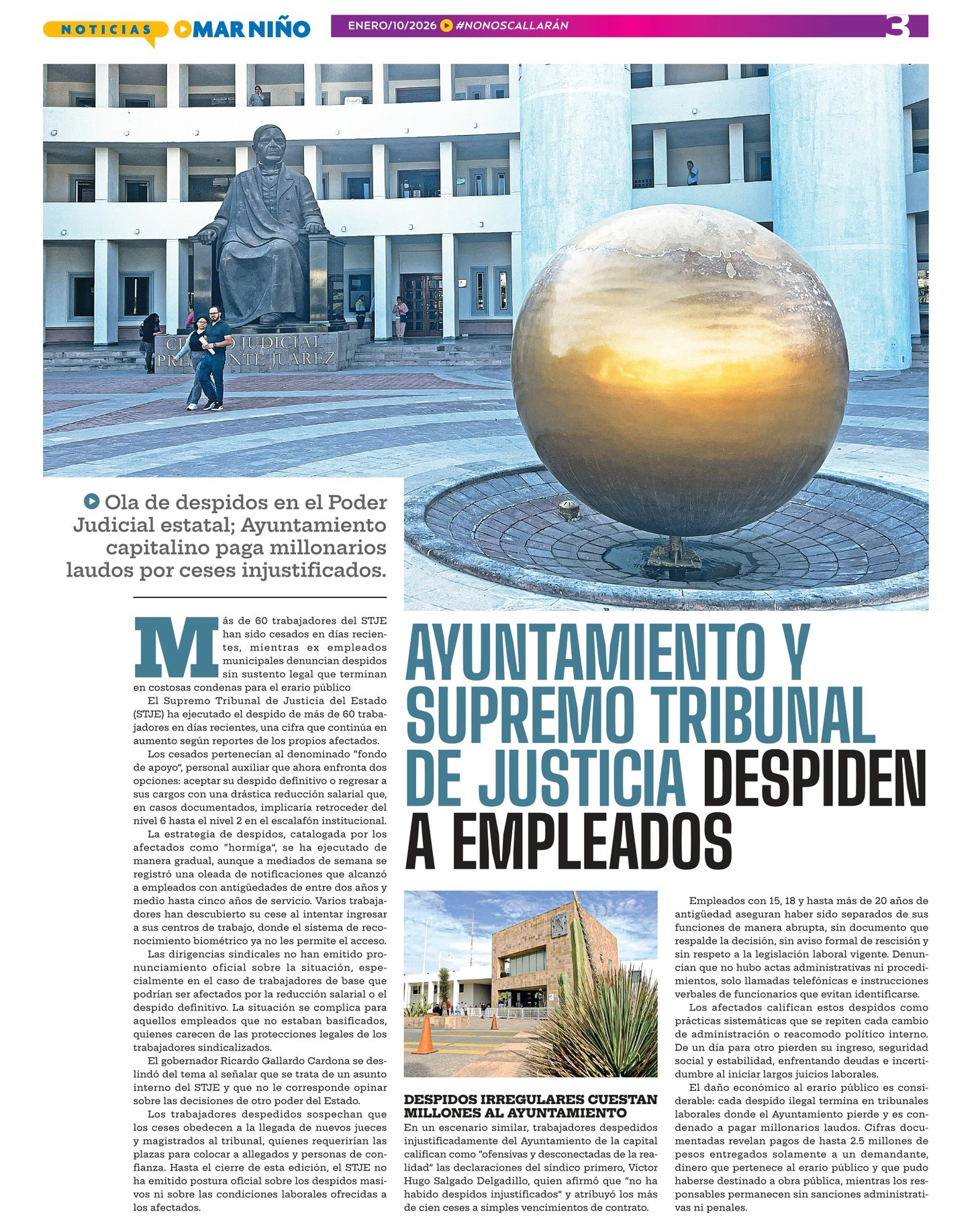 En un escenario similar, trabajadores despedidos injustificadamente del Ayuntamiento de la capital califican como «ofensivas y desconectadas de la realidad» las declaraciones del síndico primero, Víctor Hugo Salgado Delgadillo, quien afirmó que «no ha habido despidos injustificados» y atribuyó los más de cien ceses a simples vencimientos de contrato.