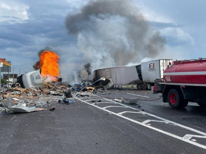 Dos tráileres protagonizaron un aparatoso accidente en el kilómetro 170 de la carretera 57, en las inmediaciones de Puente La Bonita, en el tramo Matehuala–San Luis. Uno de los vehículos se incendió tras el impacto, generando una intensa columna de humo.