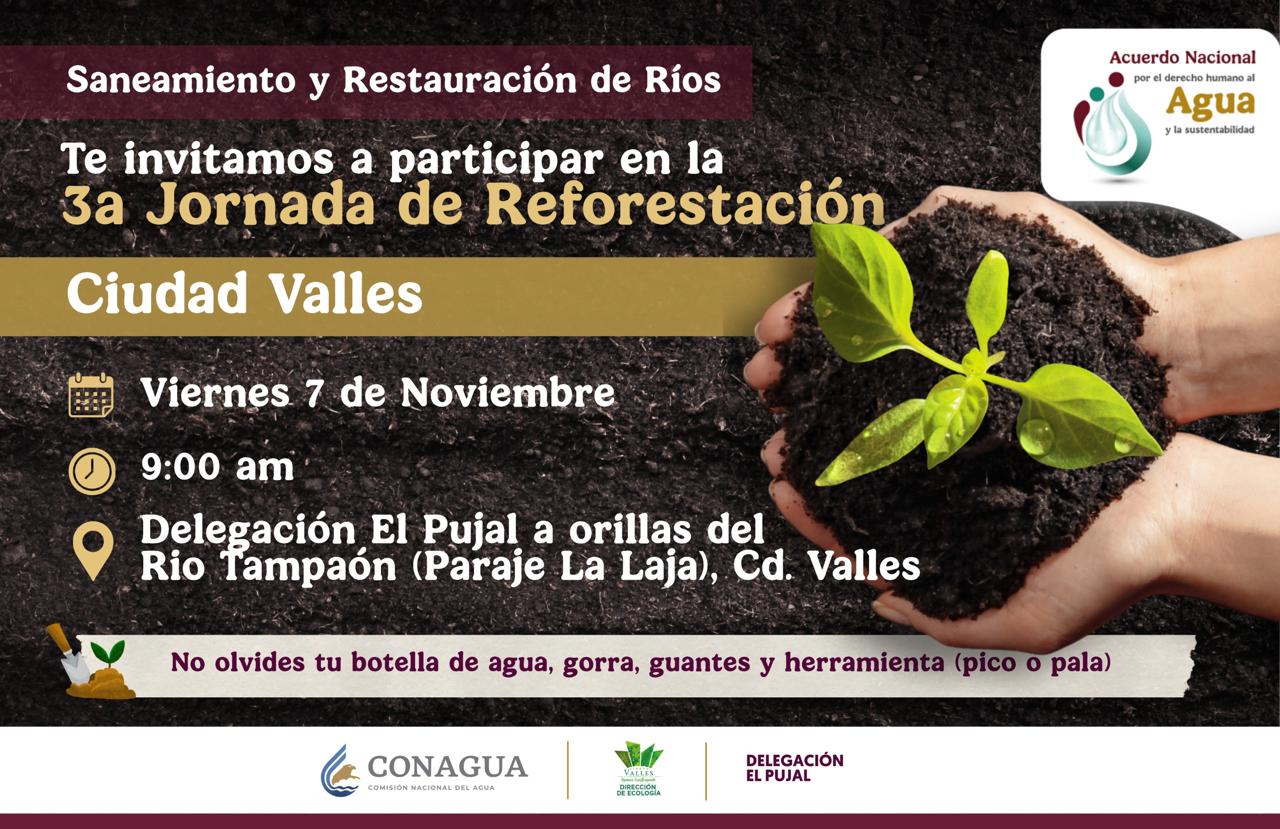 La Comisión Nacional del Agua (CONAGUA), llama a toda la ciudadanía a unirse a la Tercera Jornada de Reforestación en Ciudad Valles, con el objetivo de sumar esfuerzos en la protección de ríos y áreas verdes en dicho municipio.
