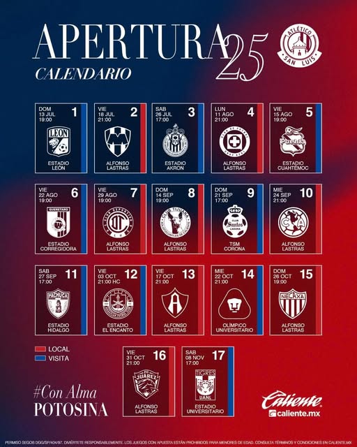 ¡Potosinos! Ya conocemos como será el camino de nuestro Atlético de San Luis en el Apertura 2025 donde una vez más, juntos afrontaremos el nuevo certamen con el alma potosina que nos caracteriza.