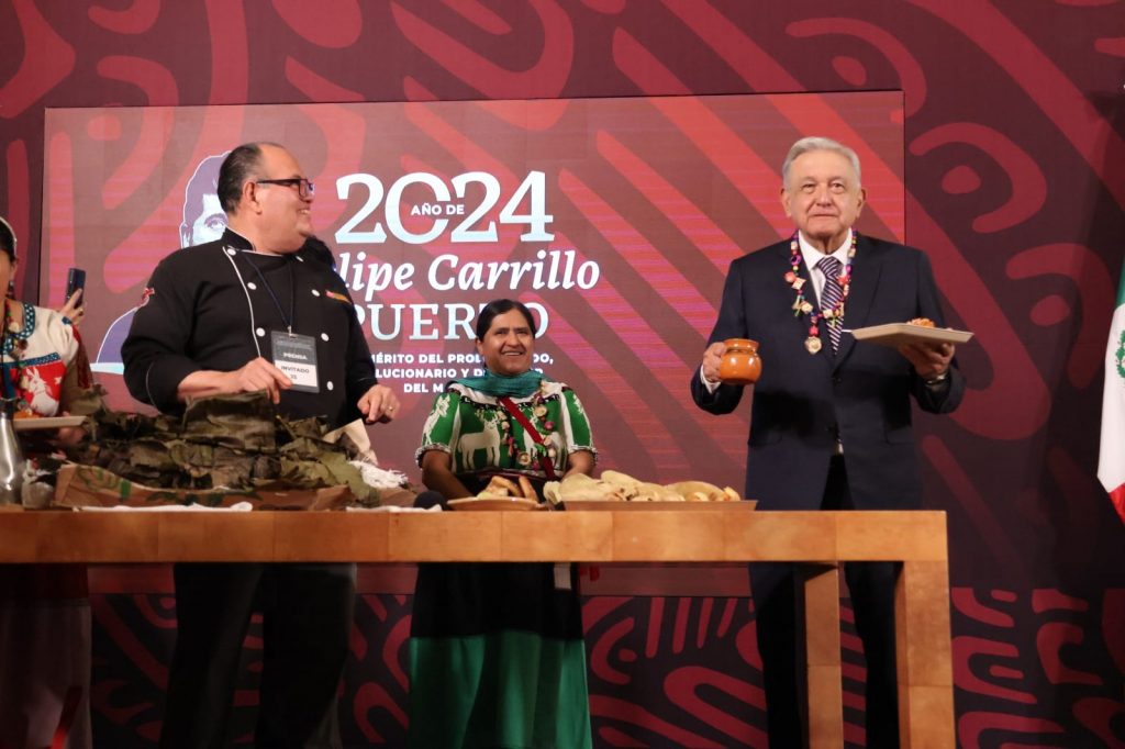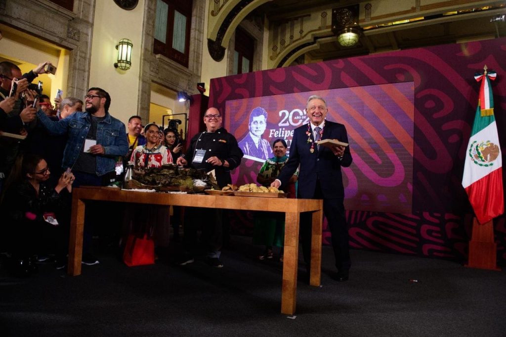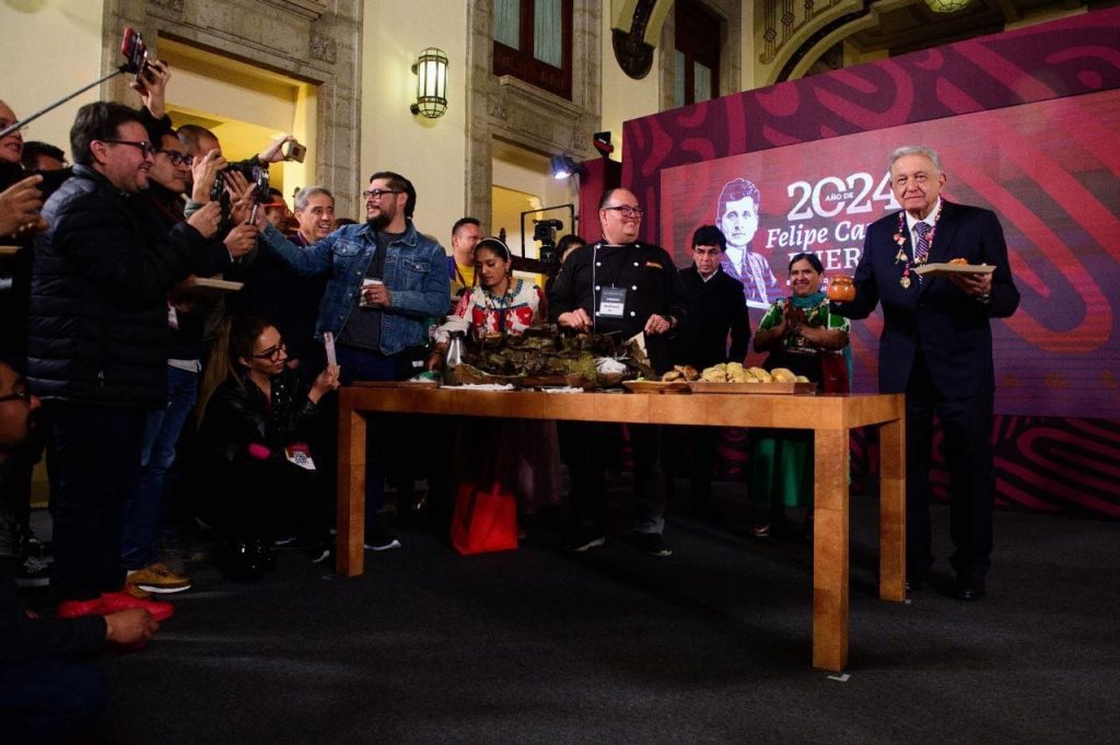 Nuestro director el periodista Omar Niño y Taurino Galvan del Rincon Huasteco llevaron un Zacahuil que se sirvió al Presidente de México, Andrés Manuel López Obrador y a los reporteros de “Las Mañaneras” en el Salón Tesoreria de Palacio Nacional en la CDMX