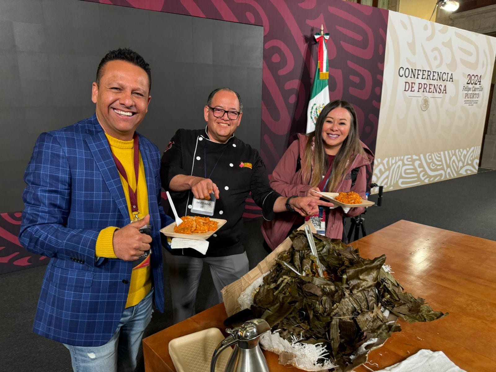 Nuestro director el periodista Omar Niño y Taurino Galvan del Rincon Huasteco llevaron un Zacahuil que se sirvió al Presidente de México, Andrés Manuel López Obrador y a los reporteros de “Las Mañaneras” en el Salón Tesoreria de Palacio Nacional en la CDMX