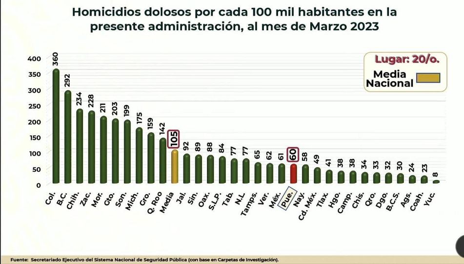 Sobre la tasa de homicidios por cada 100 mil habitantes, el presidente dio a conocer un dato del Secretariado Ejecutivo del Sistema Nacional de Seguridad Pública (SESNSP), el cual posiciona a San Luis Potosí en el lugar número 15 de estados con mayor número de homicidios.