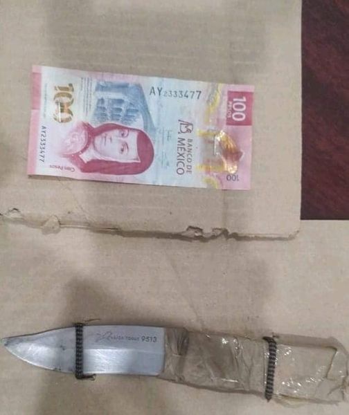 En dicha revisión que se llevó a cabo con total apego a sus derechos humanos, le fue localizado una pieza de metal afilado, con una empuñadura envuelta en cinta de plástico color café, así como un billete de 100 pesos, mismos que la ciudadana denunciante aseguró que le había arrebatado.