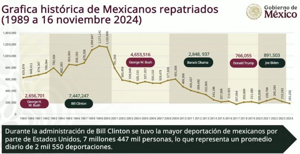 En la comparativa se observa que la cifra más alta de migrantes deportados se dio en el periodo del presidente Bill Clinton. «Durante la administración de Bill Clinton se tuvo la mayor deportación de mexicanos por parte de Estados Unidos, 7 millones 447 mil personas, lo que representa un promedio diario de 2 mil 500 deportaciones», puntualizó la mandataria.