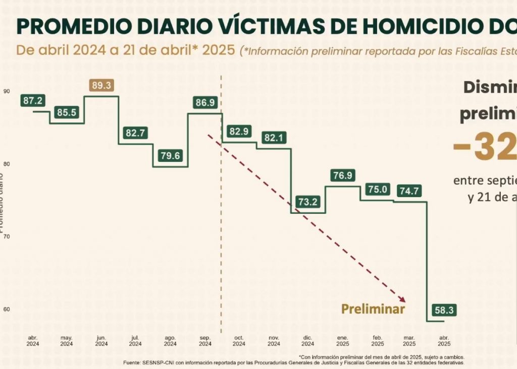 En estos 20 días del mes de abril se han reportado en todo el país 58.3 homicidios diarios, 28.6 homicidios menos que en septiembre del 2024 cuando se reportaban alrededor de 86.9 diarios.