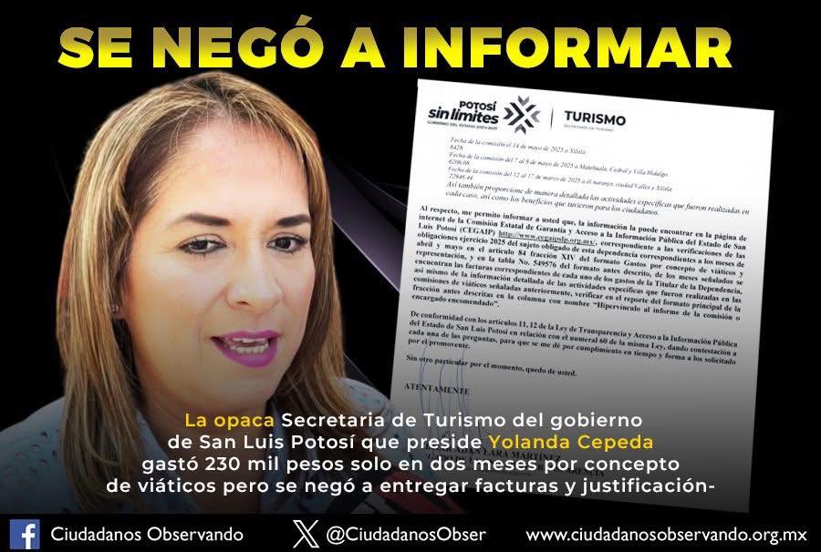 En este espacio dimos a conocer cómo Yolanda Cepeda, titular de la Secretaría de Turismo del Gobierno del Estado de San Luis Potosí, reportó tan solo en dos meses gastos por viáticos por 230 mil pesos. Esta información generó numerosas reacciones entre la ciudadanía y se difundió en varios medios de comunicación.