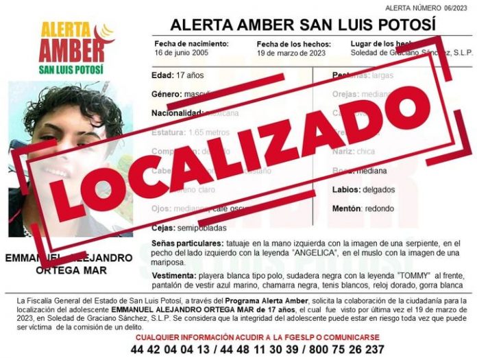 Ya fue localizado Emmanuel Alejandro Ortega Mar de 17 años de edad, por quien la Fiscalía General del Estado de San Luis Potosí (FGESLP) había activado una Alerta Amber desde el pasado 21 de marzo de 2023 en Soledad de Graciano Sánchez.