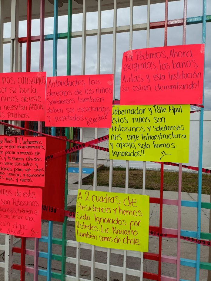 “Gobernador y presidente municipal estos niños son potosinos y soledenses nos urge infraestructura y apoyo,” se lee en las cartulinas pegadas afuera de la escuela, donde también sostiene que a pesar de estar a 2 cuadras de la presidencia municipal siempre han sido ignorados.