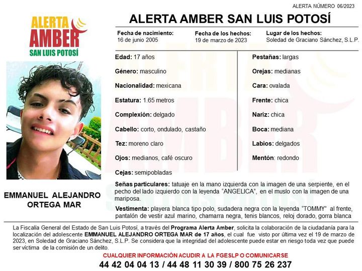 La Fiscalía General del Estado de San Luis Potosí (FGESLP) activó una Alerta Amber para la pronta ubicación de Emmanuel Alejandro Ortega Mar, de 17 años de edad.