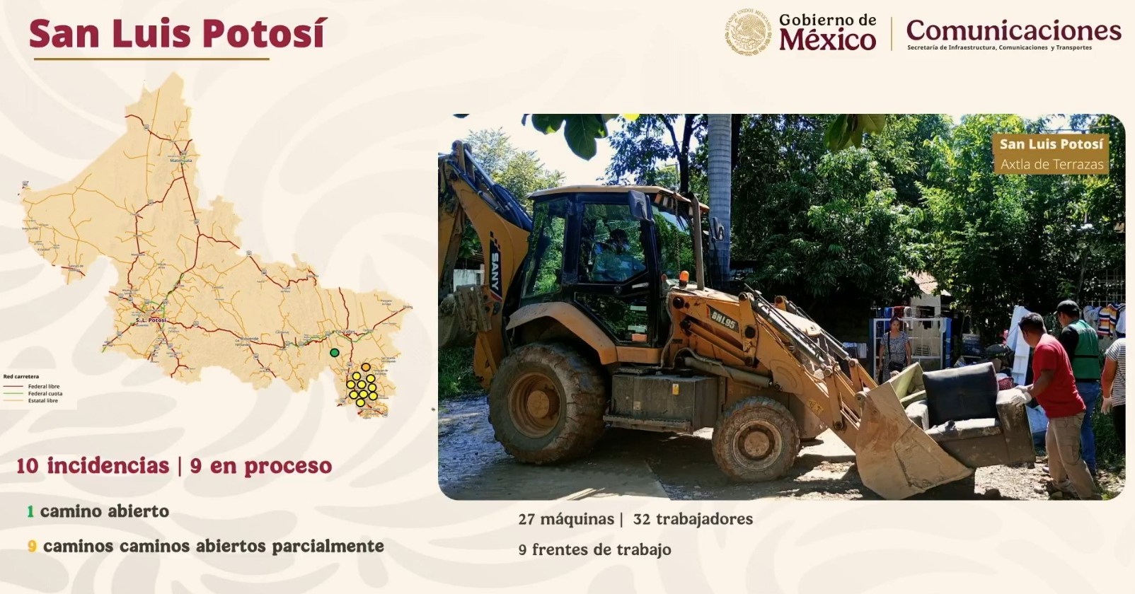 En San Luis Potosí hubo 10 afectaciones a caminos, en donde 9 ya fueron atendidos y están abiertos parcialmente, el uno restante, ya está totalmente abierto.