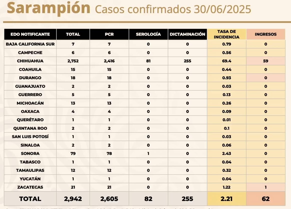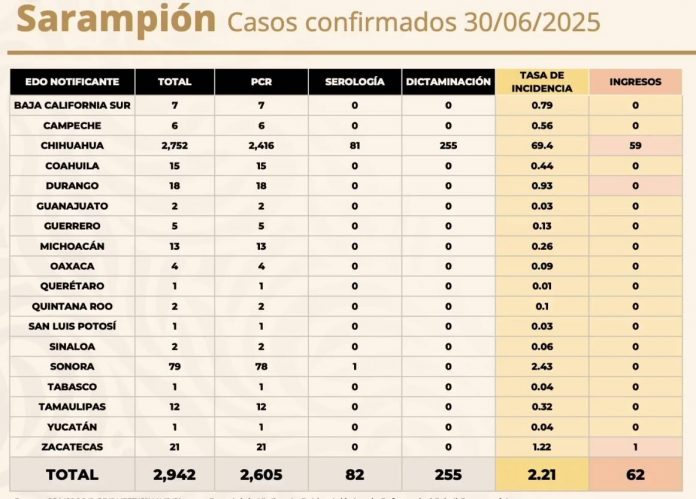Al 1 de julio de este año la Secretaría de Salud Federal dio a conocer que se tiene contabilizados 2 mil 942 casos de sarampión en todo el país.