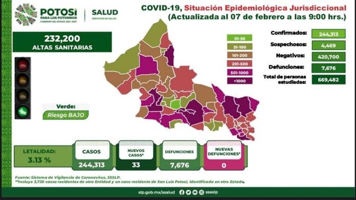 En cuanto a los casos Covid-19 en el Estado, para este 8 de febrero se dan a conocer 33 nuevos contagios, confirmando el Comité Estatal para la Seguridad en Salud y los Servicios de Salud 244 mil 313 casos totales de esta enfermedad.