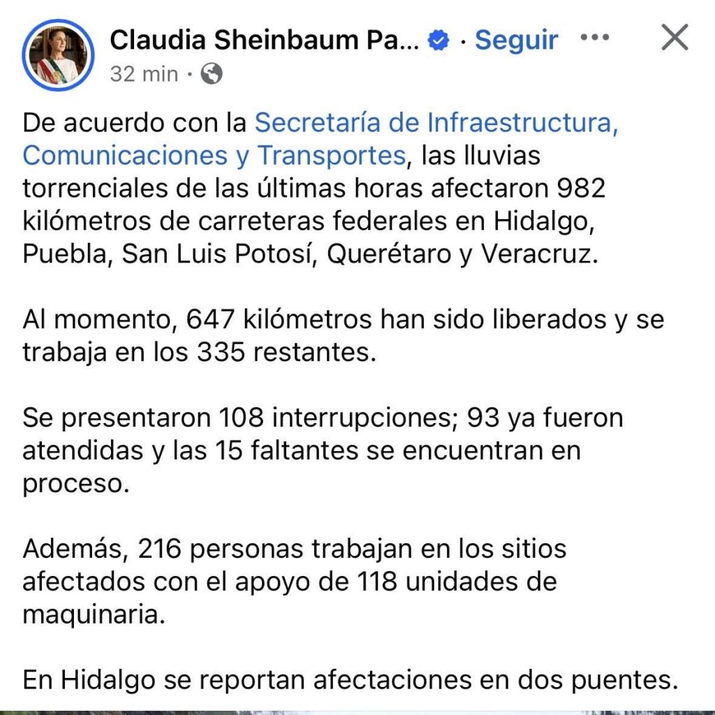 De acuerdo con la Secretaría de Infraestructura, Comunicaciones y Transportes, las lluvias torrenciales de las últimas horas afectaron 982 kilómetros de carreteras federales en Hidalgo, Puebla, San Luis Potosí, Querétaro y Veracruz.