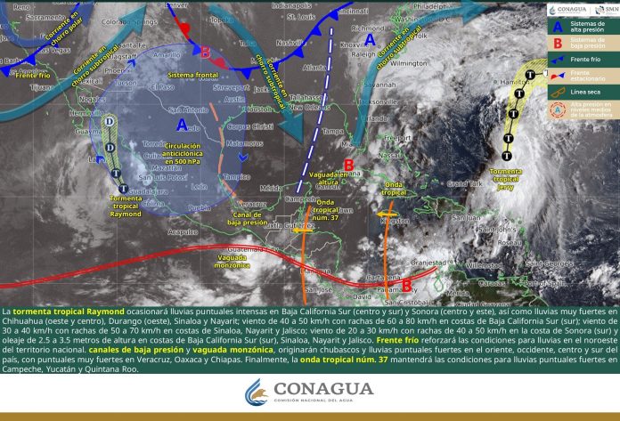 La tormenta tropical Raymond en próximas horas podría tocar tierra, pues se aproxima al sur de Baja California Sur lo que ocasionará lluvias puntuales intensas en dicho estado, así como en Sonora, Chihuahua, Durango, Sinaloa y Nayarit.