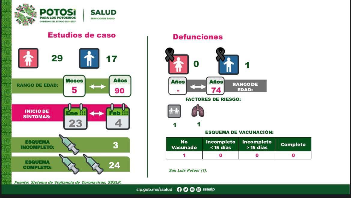 Se registra un deceso por Covid-19 en este día, por lo que la cifra aumenta a 7 mil 677 en el Estado. Esta defunción corresponde a un hombre de 74 años de edad, que contaba con enfermedad pulmonar y la edad como factores de riesgo, aunado a que no tenía aplicado el esquema de vacuna contra el Covid-19.