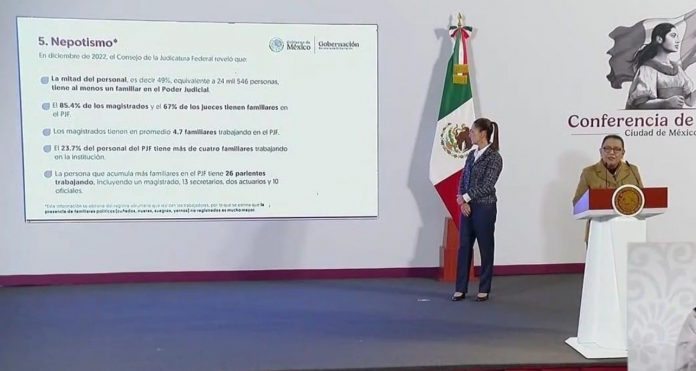 Combatir el nepotismo en el poder judicial para asegurar una administración más justa y transparente dijo hace unos momentos en la mañanera, la secretaria de Gobernación, Rosa Isela Rodríguez. El 85% de los magistrados y el 67% de los jueces tienen familiares en el Poder Judicial.