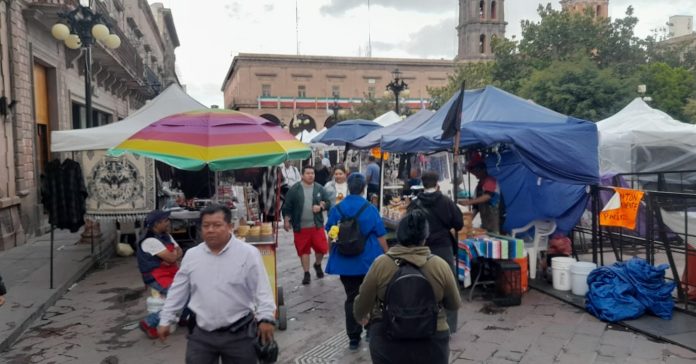 Puestos de comida, de juguetes, de ropa para hombre y mujer, de joyería de fantasía y hasta de calcetines y calzones, se apostaron en plena Plaza de Armas en el Centro Histórico de la capital potosina, convirtiéndolo en un enorme tianguis ambulante.