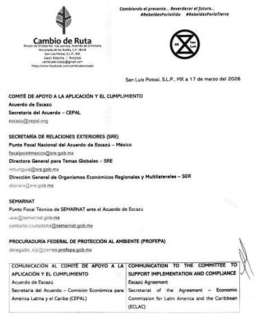 Como parte de la notificación, Cambio de Ruta A.C. solicitó a la CEPAL que el caso sea analizado formalmente, que se exhorte a las autoridades mexicanas a cumplir con los compromisos adquiridos en el Acuerdo de Escazú, y que se determinen posibles medidas para evitar responsabilidades internacionales.