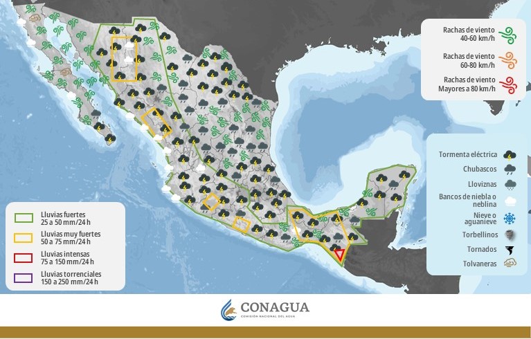 En consecuencia, se pronostican chubascos con lluvias puntuales fuertes par San Luis Potosí, Sonora. Chihuahua, Coahuila, Nuevo León, Tamaulipas, Ciudad de México, Morelos, Puebla, Veracruz y otros estados del Pacífico.