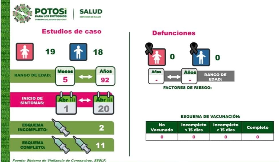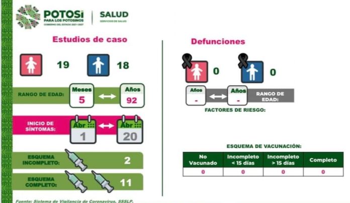 Se suma un día más sin decesos registrados por Covid-19, por lo que la cifra se mantiene en 7 mil 702 en el Estado. En lo que respecta a los estudios de nuevos casos, 19 son mujeres y 18 hombres en un rango de edad de 5 meses a 92 años, de estas personas 24 no cuentan con esquema de vacuna contra el virus.