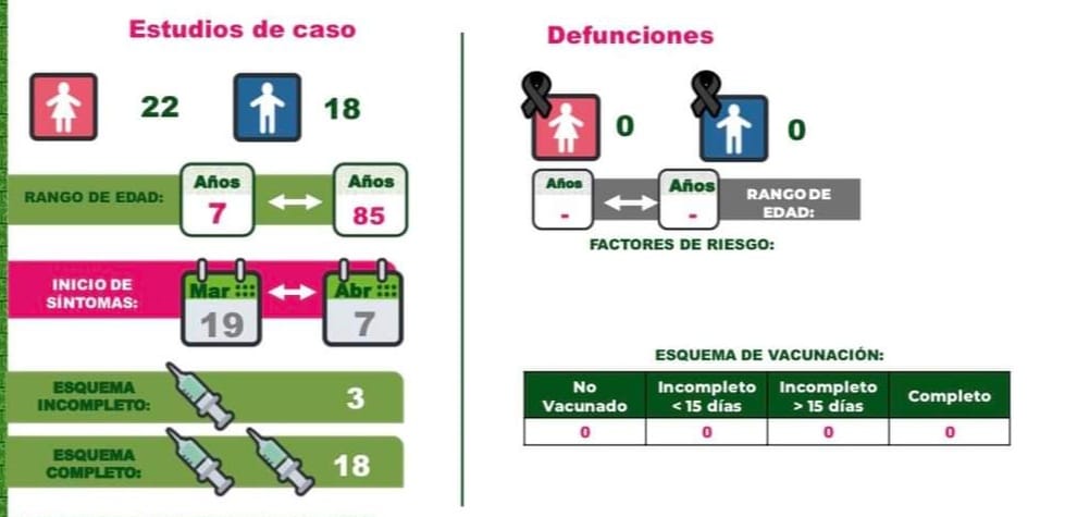 Este día no se registraron nuevos decesos en el Estado, por lo que la cifra de muertes debido al Covid-19 se mantiene en 7 mil 700; sobre los estudios de nuevos casos, 22 son mujeres y 18 hombres en un rango de edad de 7 a 85 años de edad.