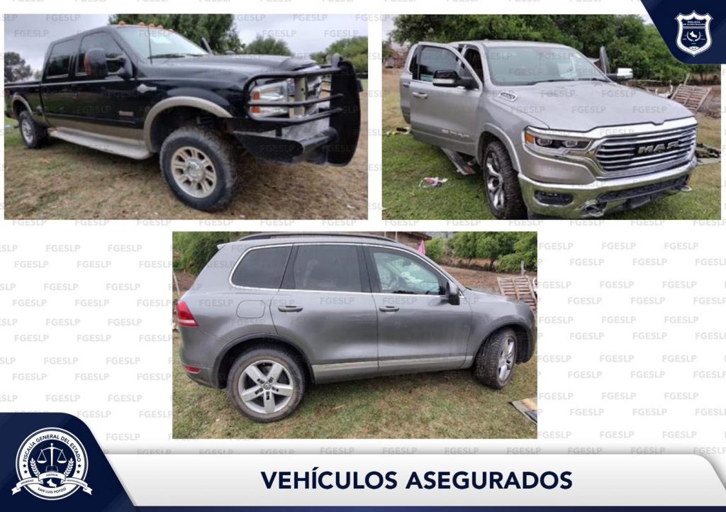 También se aseguraron tres camionetas: una marca Dodge, tipo pick up, doble camina en color gris, sin placas de circulación; una Volkswagen, tipo panel, color gris, con permiso para circular; y una unidad marca Ford, tipo F-250, king ranch, doble cabina, color negro, con permiso para circular.