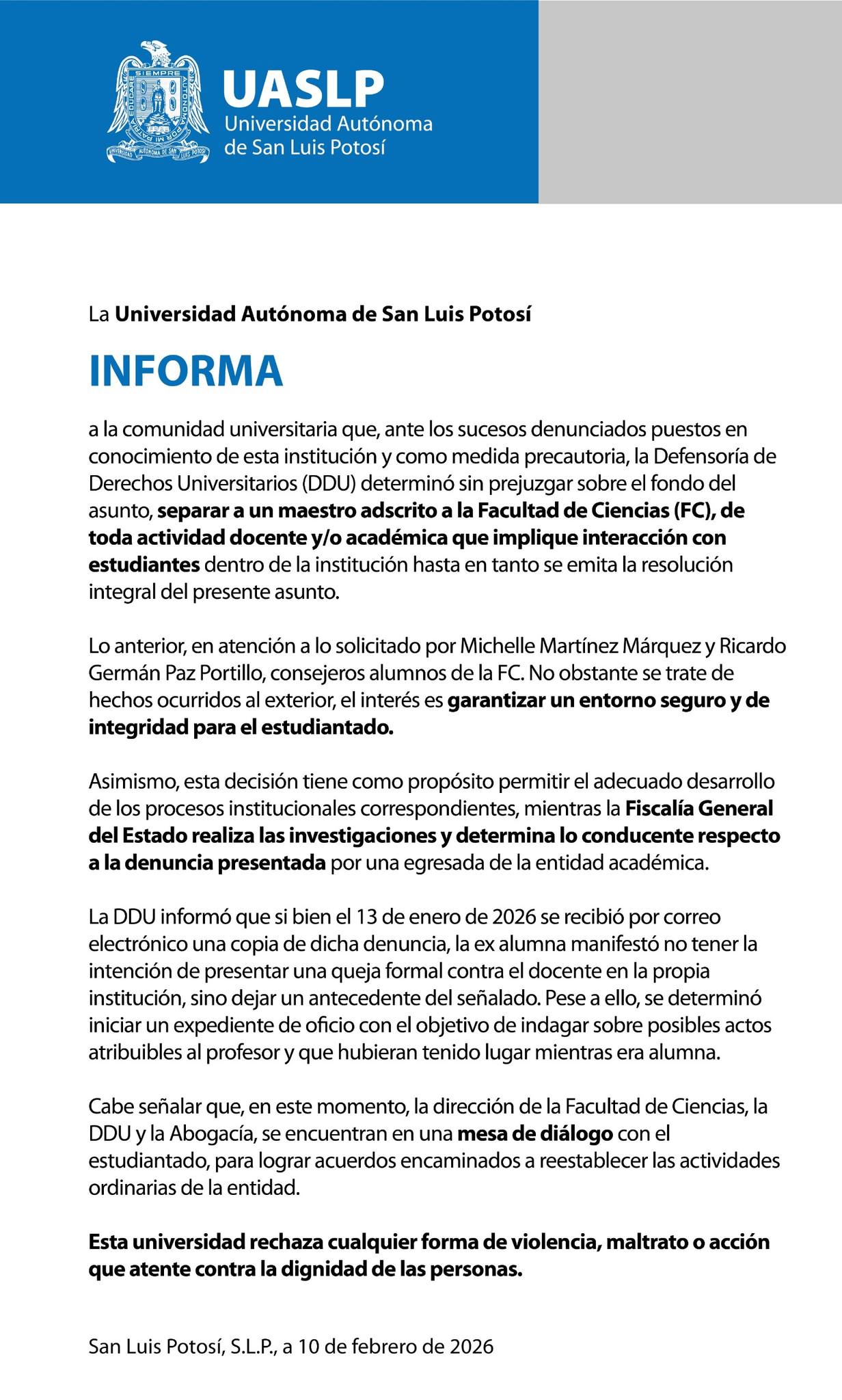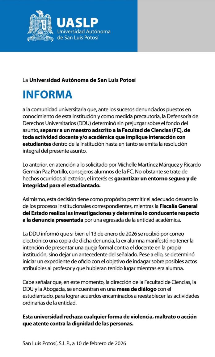Ante esto, la UASLP, informó que mientras se aclara lo sucedido, se “separará al maestro adscrito a la Facultad de Ciencias de toda actividad docente y/o académica que implique interacción con estudiantes dentro de la institución hasta en tanto se emita la resolución integral del presente asunto”.
