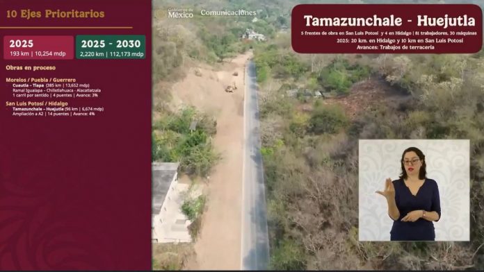 “El segundo eje es San Luis Potosí-Hidalgo. Estuvimos hace unos días en sitio anunciando la obra. Ya arrancó Tamazunchale-Huejutla. Ahí tenemos 5 frentes de obra en San Luis Potosí, 4 en Hidalgo; tenemos 30 máquinas y 81 trabajadores” detallaron.