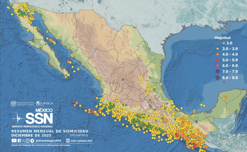 Durante diciembre de 2025, el Servicio Sismológico Nacional reportó 3 056 sismos con epicentros en territorio mexicano, los cuales tuvieron una magnitud de entre 1.1 y 5.5.