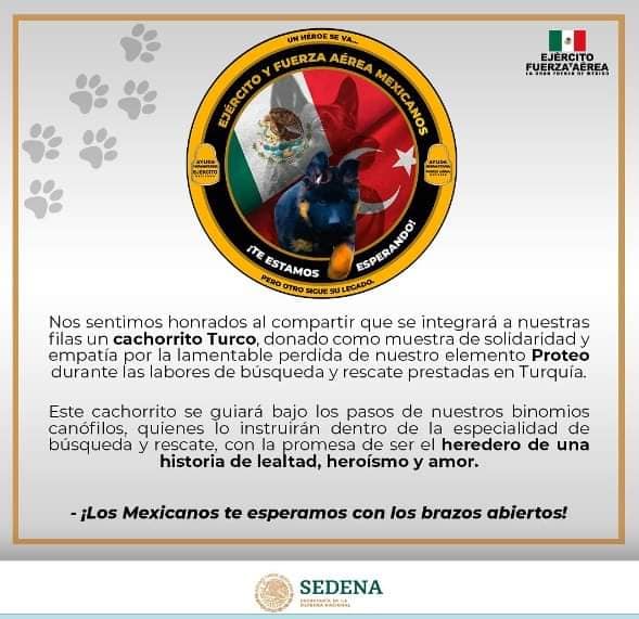 Luego del fallecimiento de Proteo durante las labores de búsqueda y rescate tras los sismos registrados en febrero, Turquía envió un cachorro rescatista a la Secretaría de la Defensa Nacional (Sedena).