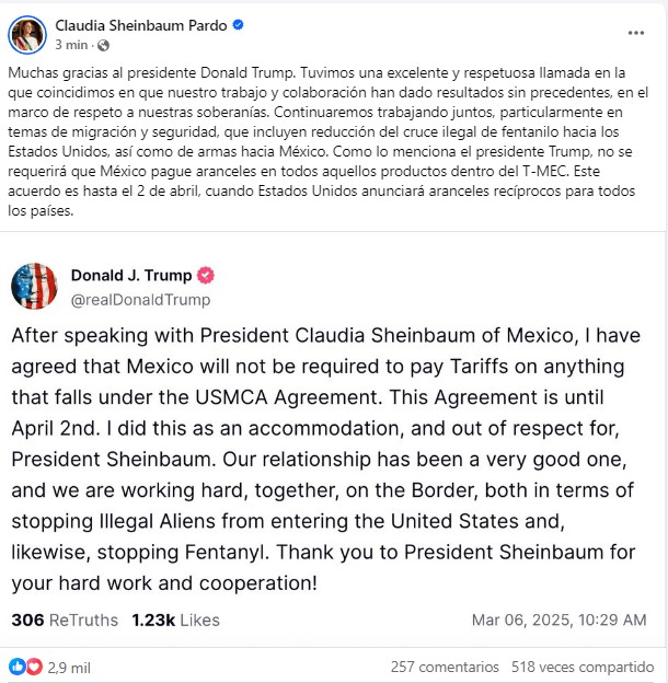 La presidenta Claudia Sheinbaum Pardo da a conocer la resolución que tuvo con #DonaldTrump acerca del tema arancelario, indica que por ahora no habrá cobros.