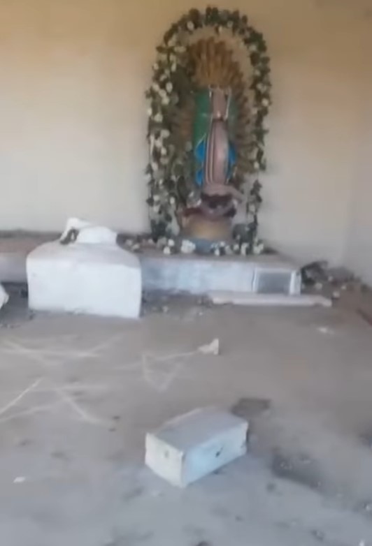 En las imágenes se observa piezas de la imagen de la virgen María, así como de otro santo, además de la cruz zafada y volteada en el piso.
